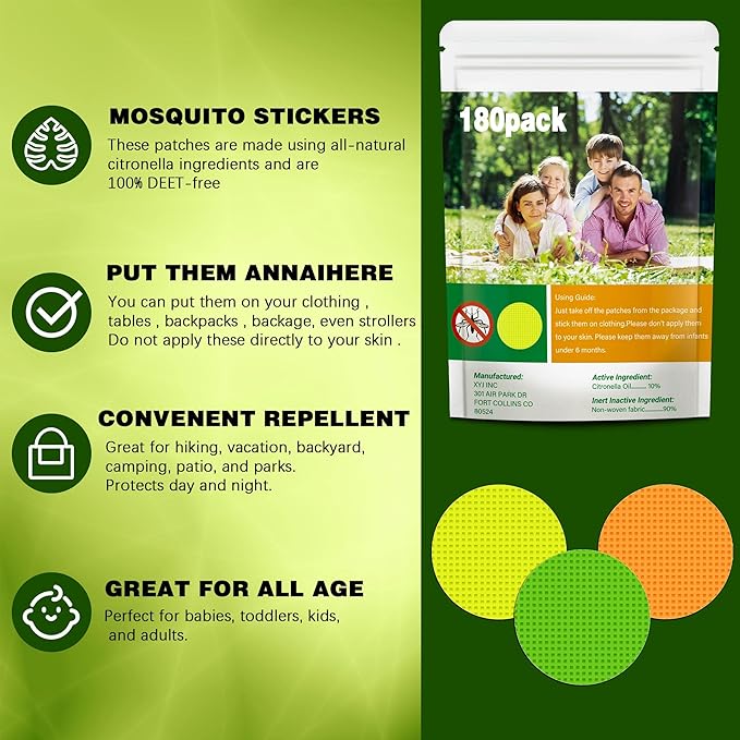- 180 big pack insect mosquito stickers for family use. They come in a resealable package to keep them fresh and effective. Enjoy the outdoors or indoors again without having to worry about the annoying itching you get from mosquito bites.