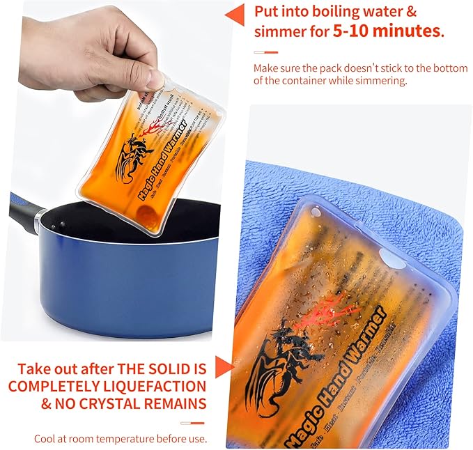 - 🔥【REUSABLE Magic Hand Warmers】Recharge by boiling your Magic Hand Warmers in water for 10 to 15 minutes. Remove and allow to cool to room temperature. They are then ready for use again and again.