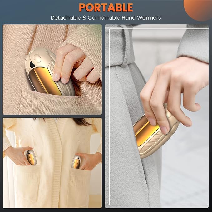 - 🔥【Safety & Portable Hand Warmer】Hand warmers have built-in intelligent protection system, high-precision chipset prevents hand warmers from overheating and scalding your hands. Hand warmer is slim and light enough to fit in your pocket or glove, it’s very portable to take it anywhere. Such as skiing, running, camping, traveling, etc.