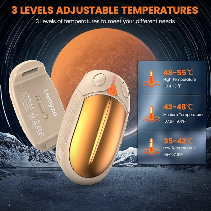- 🔥【3 Levels Temperature Electric Hand Warmer】 3 levels of temperature can meet the warm needs in different cold weather. Just press the switch button, hands are not cold any more. 3 levels of temperatures 95-107.6℉/107.6-119.4℉/119.4-131℉ to you like. With our hand warmers, cold weather no longer prevents you from doing your favourite outdoor activities.