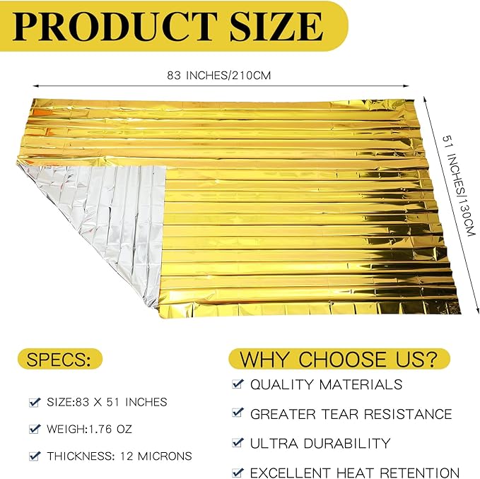 - Fully Protect Your Body: each 83 x 51 inches camping emergency warming blanket is large enough to serve as an emergency shelter survival tent or aluminum tarp emergency heating blanket