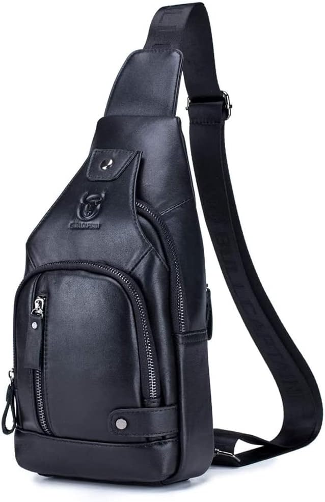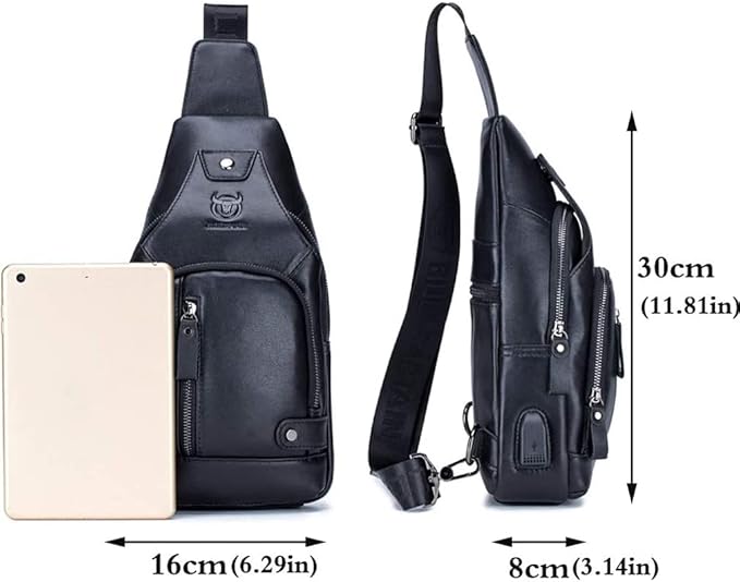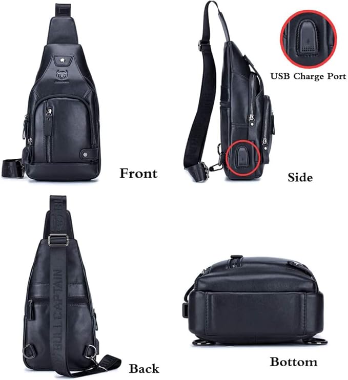 KPYWZER Genuine Leather Sling Backpack with USB Charging Port Chest Bag Outdoor Hiking Travel Daypack Black
