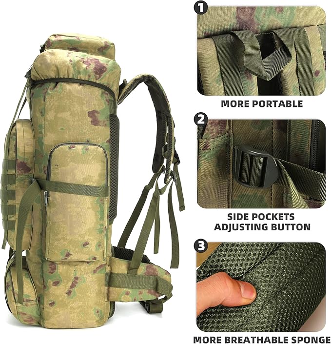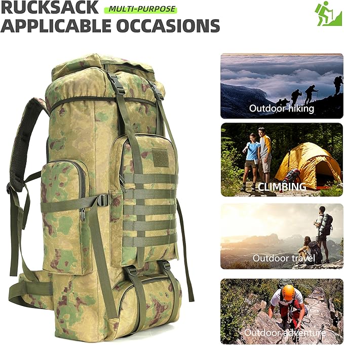 - 【Large-capacity Loading】: 80/70L large-capacity camping backpack, large-capacity main storage + 4 external system, the main bag can hold clothes, sleeping bags and travel items, and can hold 2-3 people travel equipment. Four external systems can be used for daily necessities + side water bottles.