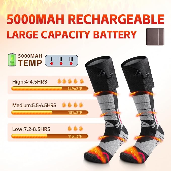 - 【8 hours Rechargeable battery 】Warm your feet in seconds thanks to a pair of 5000 mAh batteries with UL/CE certification. Incredibly efficient, certified safe.