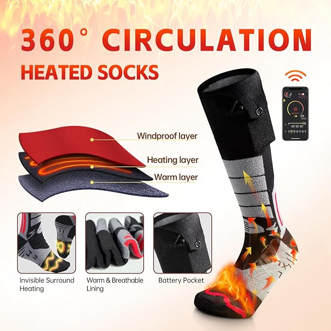 Electric Heated Socks, Rechargeable Heated Socks for Men Women Washable 2022 Upgraded Bluethooth APP Control 5000mAh Barrery Powered Feet Warmer Socks for Hunting Skiing Fishing Camping-XL