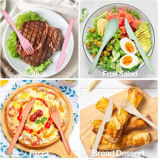 - ECO-FRIENDLY - Our camping utensils are made of natural wheat straw and food PP, lightweight but durable, chip resistance, reusable and dishwasher safe. Tip:Please keep the wheat straw tableware far away from fire.
