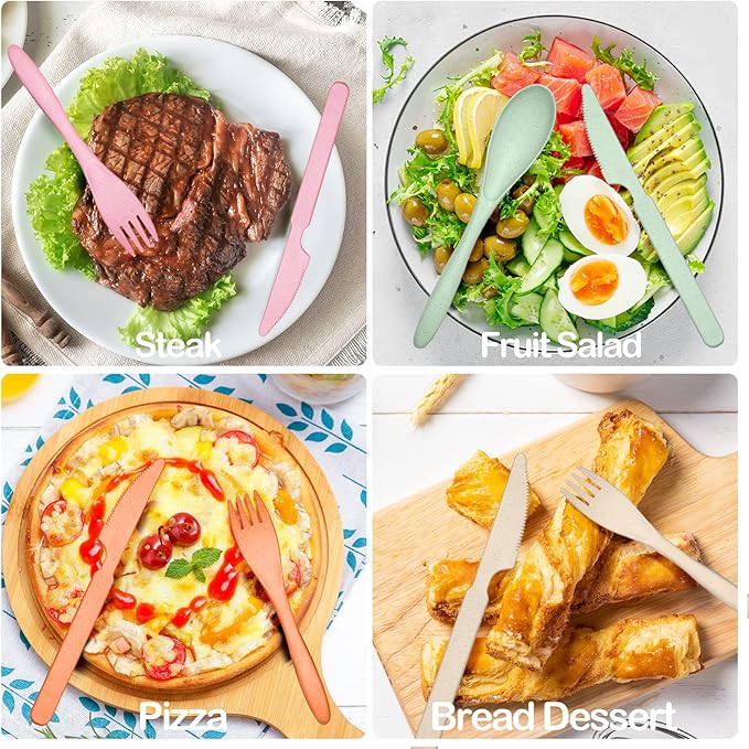- ECO-FRIENDLY - Our camping utensils are made of natural wheat straw and food PP, lightweight but durable, chip resistance, reusable and dishwasher safe. Tip:Please keep the wheat straw tableware far away from fire.