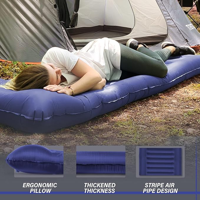- Extra Thick Camping Pad: TOBTOS sleeping pad is wider and thicker than others on the market. It can be up to 6 in thick once full of air, which is our biggest advantage. It can stay away from the hard ground and sleep comfortably in any sleeping position