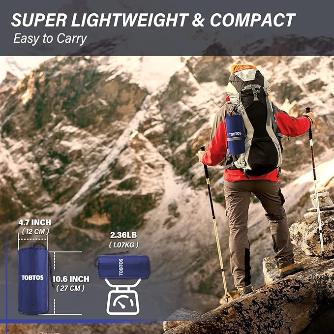 • Extra Thick Camping Pad: TOBTOS sleeping pad is wider and thicker than others on the market. It can be up to 6 in thick once full of air, which is our biggest advantage. It can stay away from the hard ground and sleep comfortably in any sleeping position