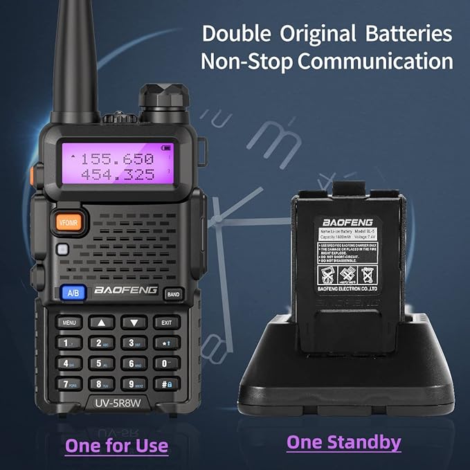 - High / medium / low power TX selectable,Outpower:8Watts;Dual band / Dual display / Dual standby,128 groups of storage channels;50 CTCSS and 104 CDCSS,AUTO Keypad Lock,LED Flashlight;FCC ID: 2AJGM-UV5R.