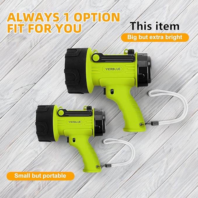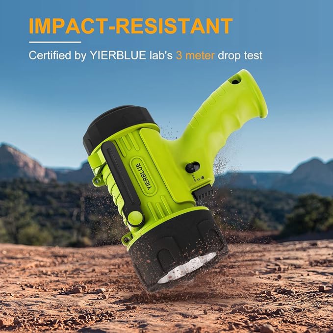 - WATERPROOF & FLOATING, IMPACT RESISTANT: This spot lights outdoor handheld is IP67 waterproof and submersible up to 3ft, and even float back up to the surface if it’s dropped in water. The High strength ABS housing with silicone protective case ensures maximum durability, rugged body withstands dropping from up to 10ft.