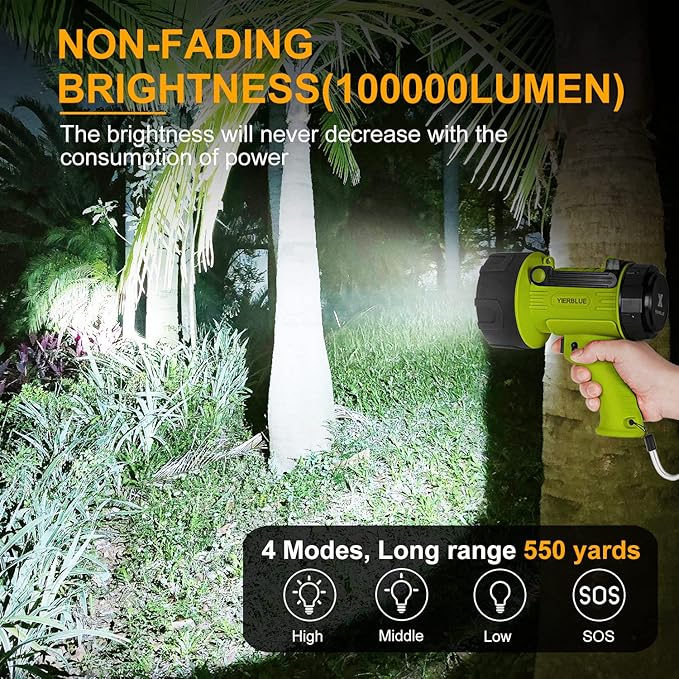 YIERBLUE Rechargeable Spotlight Flashlight with 1000,000 Lumen LED, IP67 Waterproof Long Running Spot Light searchlight, Impact Resistant Handheld Spotlight with Foldable Stand and Detachable Red Lens