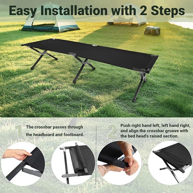 - Portable & Easy Set up: The camping cot is includes storage bag, the size could fit in most car trunk. No tools needed. With folding design, the camping bed is easy to open or fold in seconds which helps you save much more time.