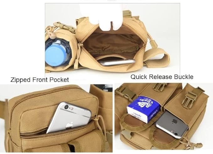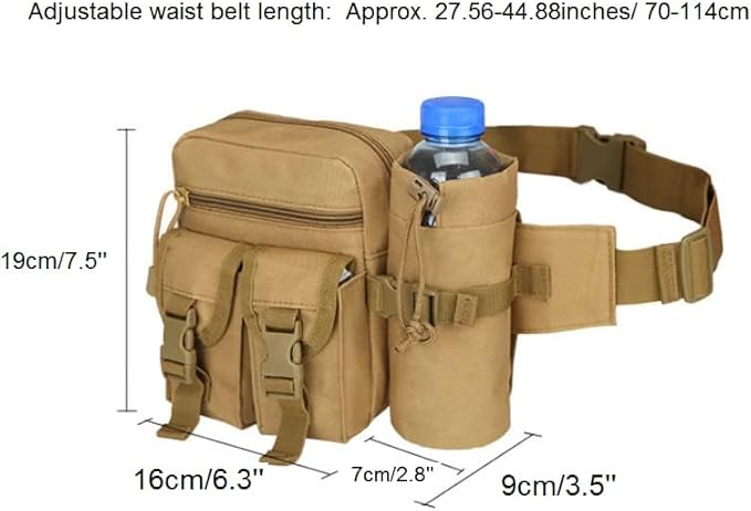 • Functional: We have two zip compartments in front of our pockets. As an organizer of a practical tool, it is very suitable for storing the phone, key chain, paper towels, GPS devices, digital camera, medical supplies, gadgets, and other what you want, size 7.5 x 5.9 x 2.8 inches (including pouch only), the side has a removable water bag, tied to gold can be at ease use, the diameter of the bottle is about 7 cm, can adjust the belt according to the volume of the bottle.