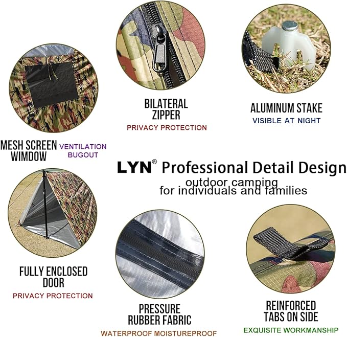- Included Components : Aluminum Stakes, Telescopic Poles, Camouflage Tent, Nylon Paracord Ropes, Inner Bags