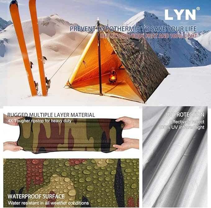 LYN Extra Large Zipper Reusable Survival Emergency Shelter Tent,Thermal Waterproof Fireproof Lightweight Bugout, with ParacordāStake for Camping,First Aid,Hiking&Bushcraft