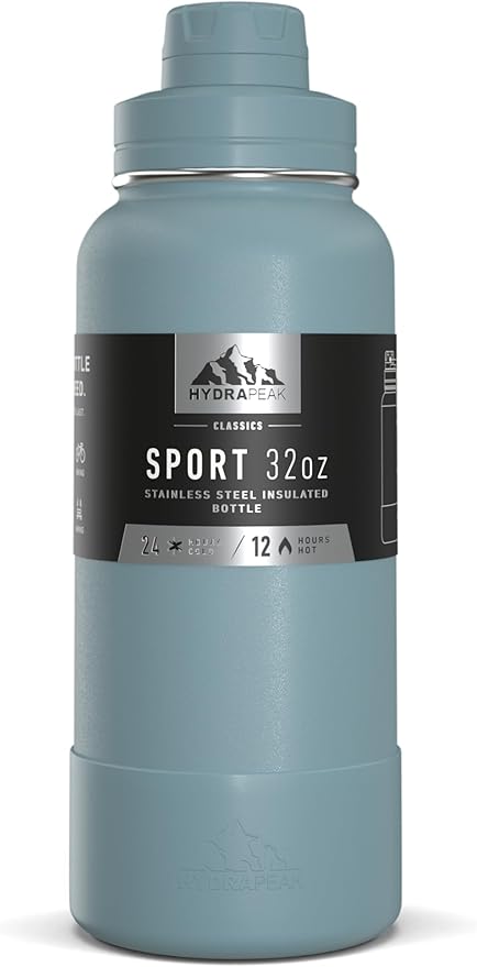 Hydrapeak 32oz Sport Insulated Water Bottle with Chug Lid, Leak & Spill Proof, Keeps Drinks Cold for 24 Hours, Hot for 12 Hours, Premium Stainless Steel Water Bottles (32oz, Modern Blue)