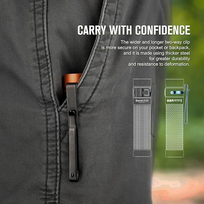 - [Two-way Clip] The wider and longer two-way clip is more secure on your pocket or backpack, and it is made using thicker steel for greater durability and resistance to deformation