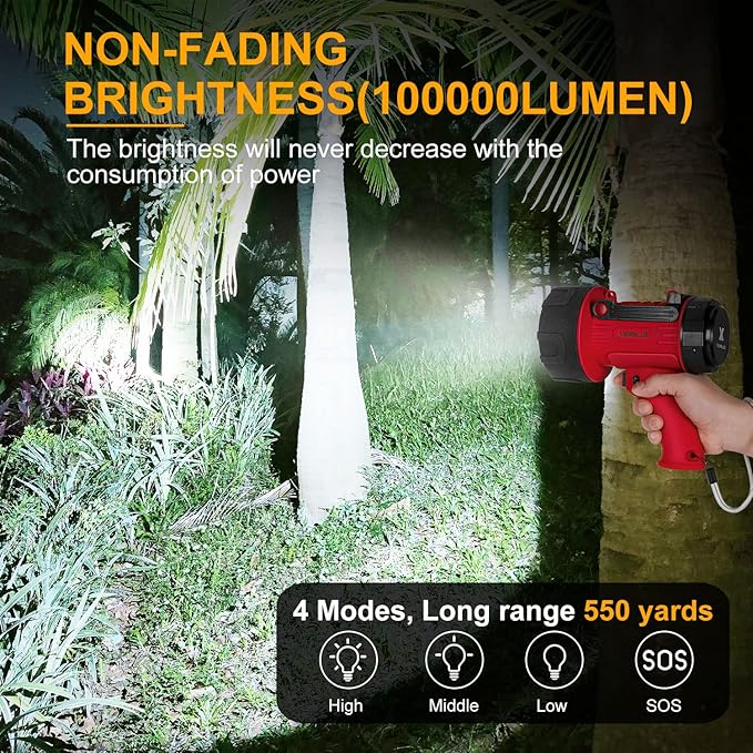 - EXTRA BRIGHT HEAVY DUTY FLASHLIGHT: Its brightness is several times that of the small model.This extra bright LED spotlight casts a 1000,000 high lumen beam out to an incredible 550 yards. LEDs boast an extended 50000-hour lifespan. Features 4 adaptable settings: High / Middle / Low / SOS(Long press 3 seconds).