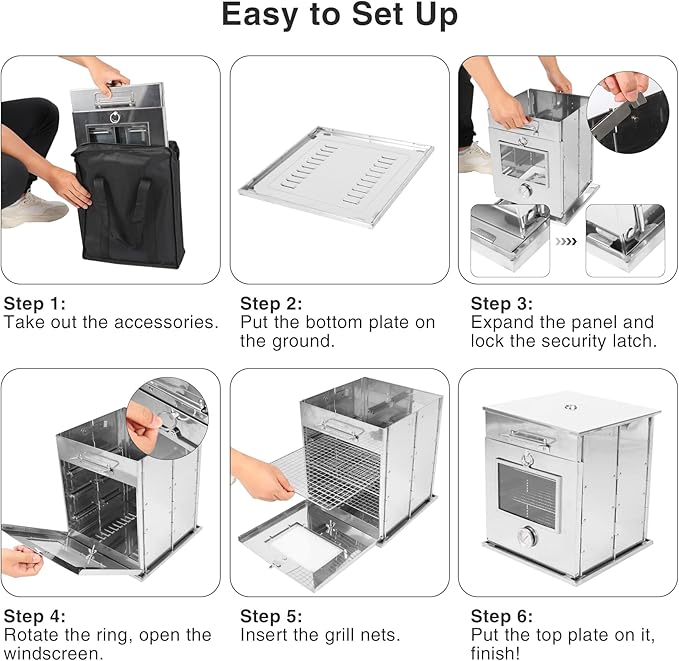 - Easy to Assemble: The portable camp oven can be assembled easily in a few minutes without any help. It is foldable and easy to carry. The extra carry bag allows you to take it everywhere.
