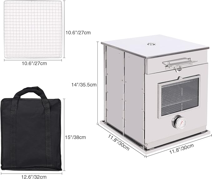 - 3 Grill Grates: The open size of the camping oven is 11.8’’x11.8’’x14’’/30x30x35.5cm. The weight is 11.7lbs/5.3kg. There are 3 grill grill grates to hold different food.