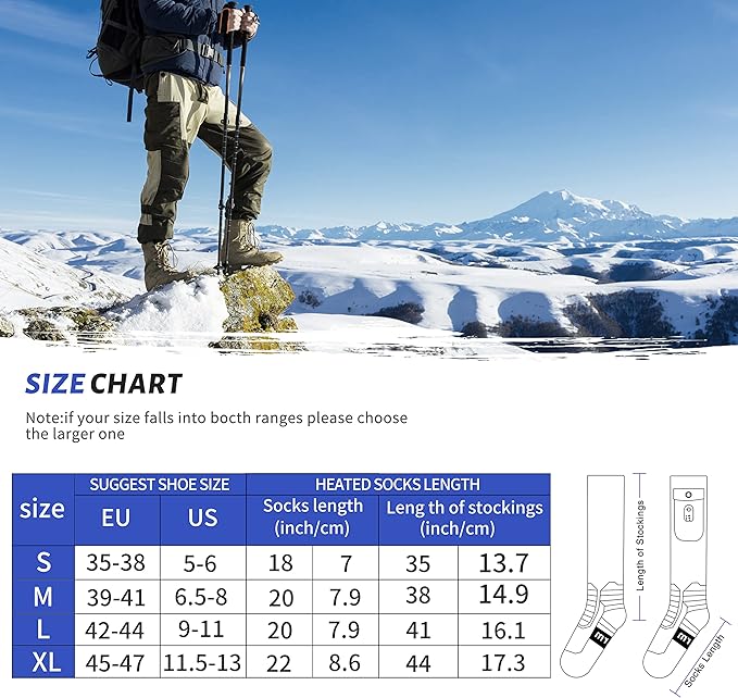 - 【Washable Premium Material】Made of a carefully-designed mixture of materials, these heated socks possess good characteristics of heat reservation, lightweight, and softness. The thickness of the sox reaches up to 3mm, which can maintain the temperature inside the socks and provide you with softness. SUGGEST wearing the heated socks in loose shoes such as boots. Size S is suitable for Kids as well.