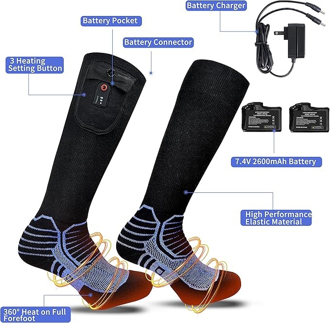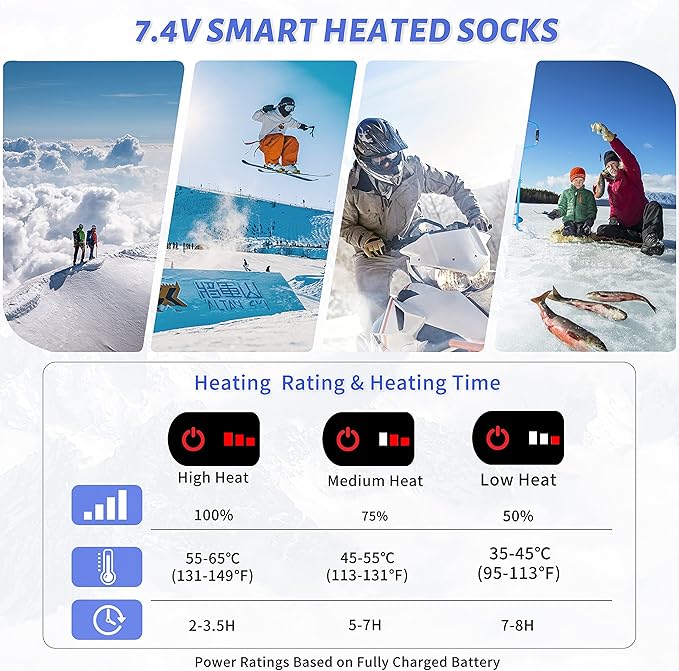 - 【Long-Lasting Battery】These heated socks include two large-capacity 3000mAh rechargeable Li-lion batteries, which can heat up for around 3.5-8 hours. The battery can be fully charged in about 4 hours. Ideal for any outdoor winter activities and keep you warm all the time.