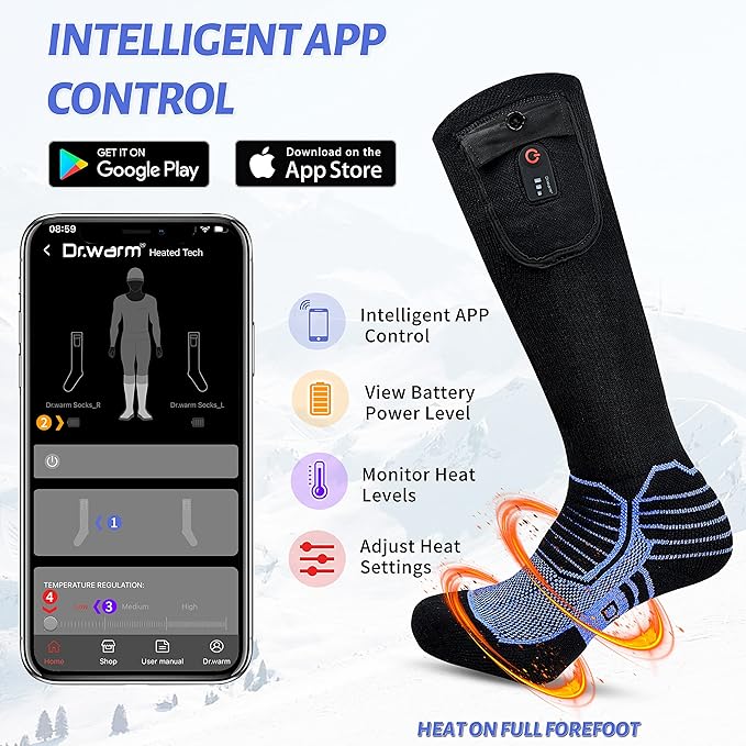 - 【Smart APP Control Heated Socks】The Dr.Warm SS01 heated socks can be controlled through our exclusive Dr.warm APP or the button on battery pocket. With our Dr.Warm mobile app, you can check and adjust the heat setting for your insoles in real-time using your smartphone.