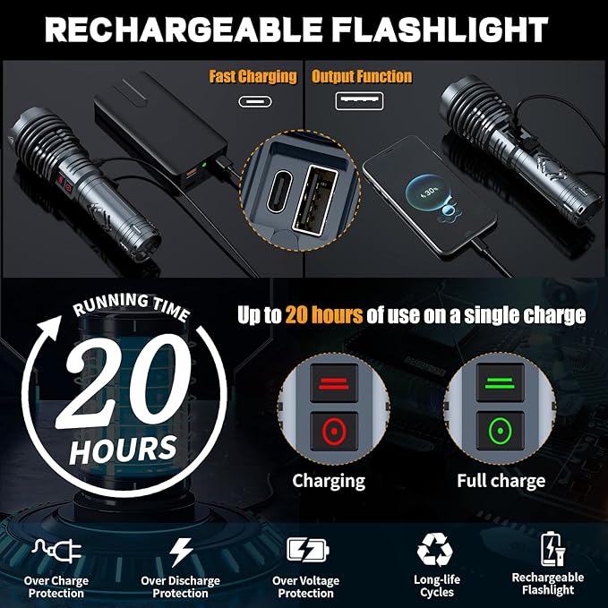- 【WIDELY USED & OUTDOOR ESSENTIAL HANDHELD FLASHLIGHTS】This rechargeable Flashlight for emergencies can be used as an emergency energy source to charge some common USB devices, such as cell phones, headphones, etc. Powerful Flashlights high lumens are not only suitable for daily use such as camping, night dog walking, night running, night fishing, night riding, hiking, but also for police night patrol, car maintenance and other workplace such as gas stations, charging stations, chemical labs, airports, warehouses, etc.