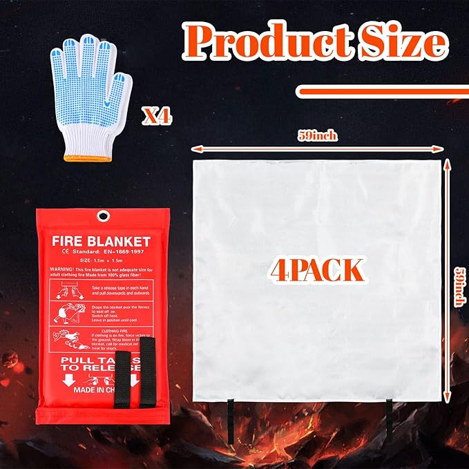 - Package Includes: the package contains 4 pieces of 59 x 59 inches fire blankets and 4 pairs of gloves, which can help you stop stove top fires quickly, and they are easy to use and clean, the fire blankets set is an important helper to your home fire extinguisher