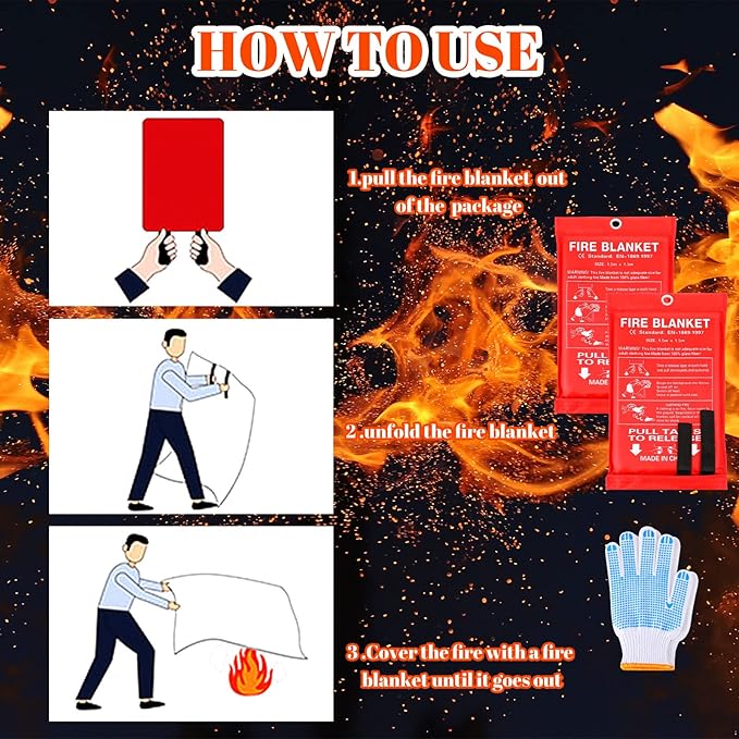 - Easy to Use: simply pull down the two straps of the fire retardant blanket and spread it out to cover the root of the fire, let the emergency fire blanket sit there for a few seconds to suffocate the fire, turn off the stove or any heat source, waiting for the blanket to cool and then throw it away, and each fire blanket kit comes with gloves, convenient for you to use