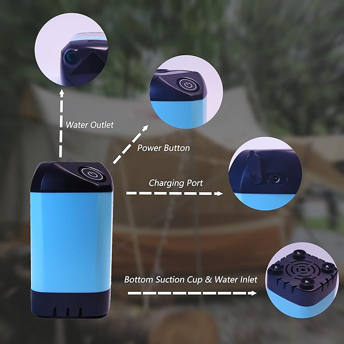 - The portable outdoor camping shower can be charged anytime and anywhere using the USB interface, and the bottom of the pump body is detachable and has a built-in filter that can be cleaned repeatedly. The shell is made of ABS material, allowing for a healthier and more comfortable bathing experience.