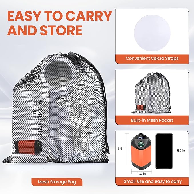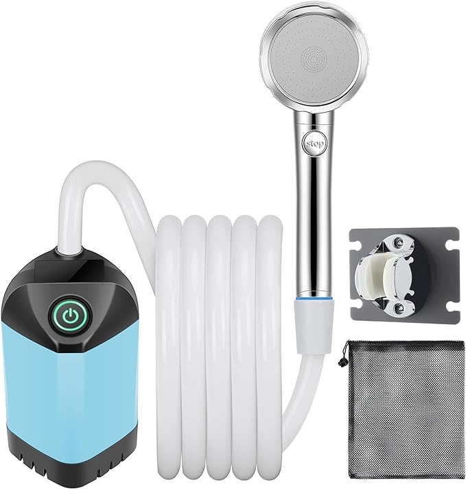 - The portable shower pump is lightweight, compact, and comes with a free storage bag for easy storage. B013 camping shower is equipped with a thickened 2-meter-long PVC water pipe, shower rack, shower head, and USB charging cable.