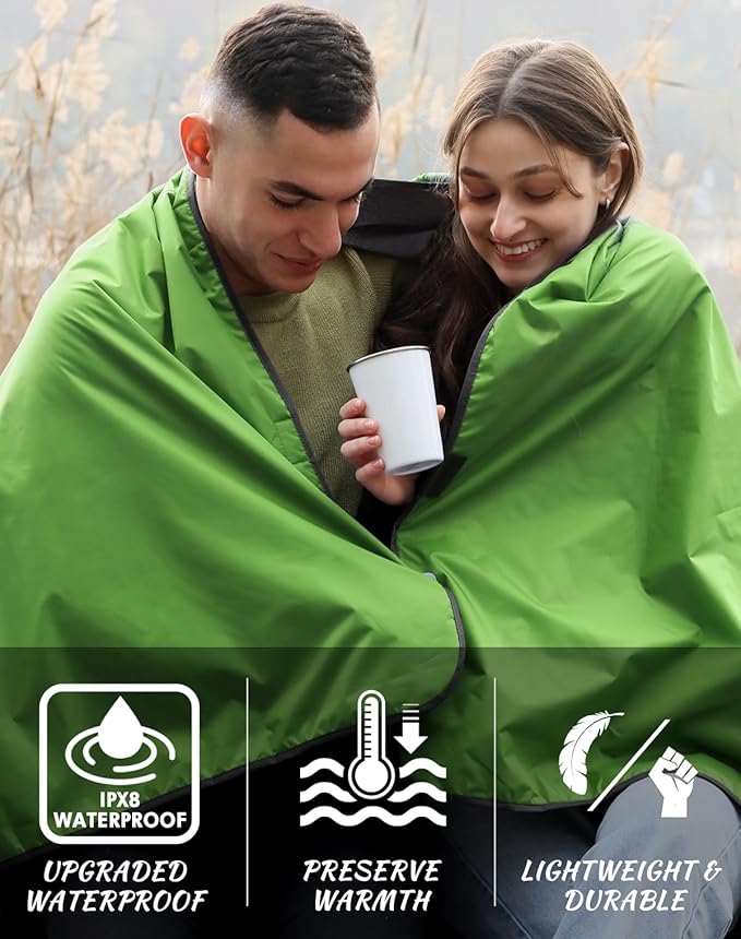 - ✅ 𝗘𝗫𝗧𝗥𝗔 𝗟𝗔𝗥𝗚𝗘& 𝗨𝗟𝗧𝗥𝗔-𝗟𝗜𝗚𝗛𝗧:This large outdoor camping blanket measures 79 x 59 inches (equivalent to a Queen Size Mattress) is large enough to wrap up to 2 adult. The large waterproof outdoor blanket is specially designed with a hook&loop fastener, so that you can wear it on your body to free your hands.