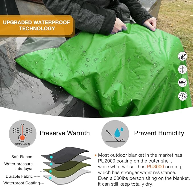 - ✅ 𝟭𝟬𝟬% 𝗪𝗔𝗧𝗘𝗥𝗣𝗥𝗢𝗢𝗙 𝗢𝗨𝗧𝗗𝗢𝗢𝗥 𝗠𝗔𝗧:This durable and ultra-comfortable outdoor fleece blanket is made of 300 grams per square emboss polar fleece + high-quality PU3000, 210T waterproof and windproof nylon. Withstand extreme cold, strong wind and other weather, keep you warm, comfortable and dry at all times.