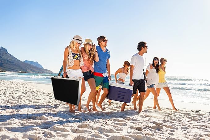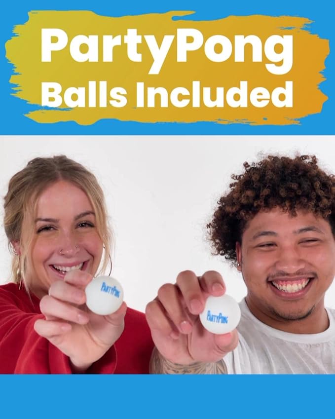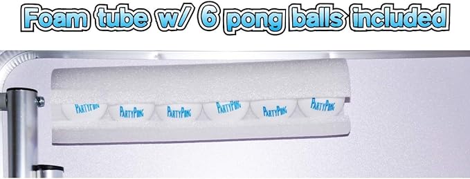 - Table and legs easily folds into a carrying case w/ locking latch & handles. Attached, foam pong ball holder under the table w/ (6) PartyPong balls. High quality pong balls have excellent bounce.