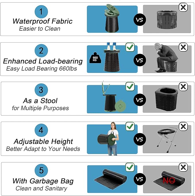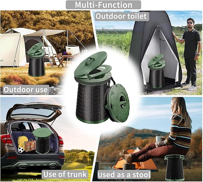 - ▶【Multi-Functions Toilet Stool】The integral folding toilet stool can be used as a adjustable telescopic chair with a gentle pull, and can be used as a camping toilet when the top cover is lifted. A storage and seat combination, a trash can, a storage box, an indoor toilet for the elderly, a pregnant woman vomit bucket, women and men toilet, etc. You can do it freely Selecting scene switching is very practical.