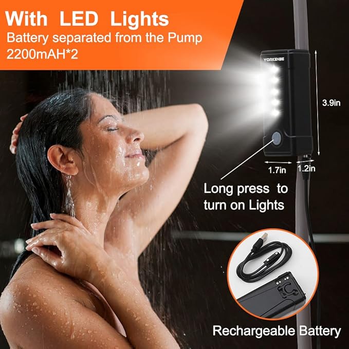 - 【With Detachable USB Rechargeable Battery】The portable outdoor shower adopt USB rechargeable batteries, separated from the pump. No need to immerse the batteries into water to protect and enhance the batteries life. The battery pack has an LED to indicate "low battery", and charge status. Shower camping adds LED lights to the battery to provide illumination.