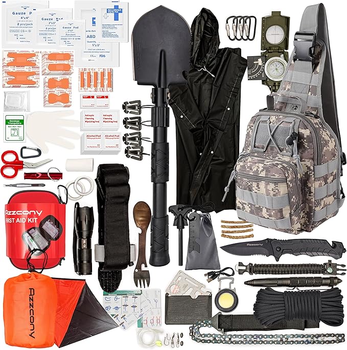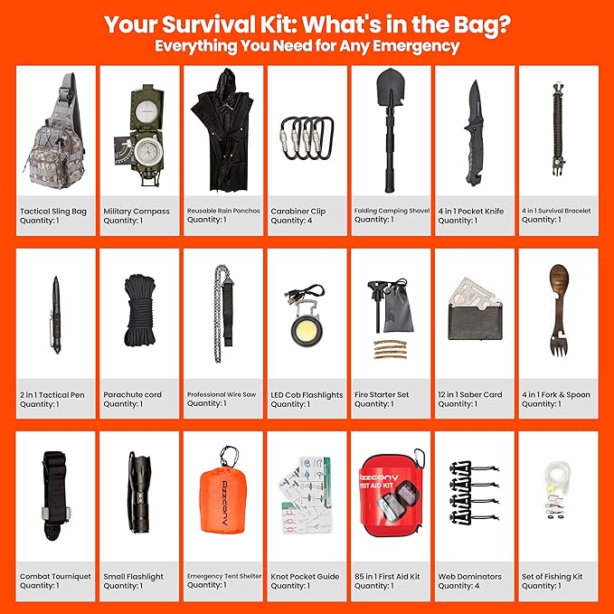 - Top Practical Survival Tools: All survival gear in this kit are essential, including a Multifunction Shovel, 12 in 1 Saber Card, 4 in 1 Survival Bracelet, Combat Tourniquet, 1 Set of Fishing Kit, Fire Starter, Modern Compass, Flashlight, Flashlights, Raincoat, Emergency Tent Shelter, First Aid Kit, Professional Wire Saw, Tactical Pen, 2 in 1 Fork & Spoon, 4 Web Dominators, 4 Climbing Hooks and more, which can meet your different needs.