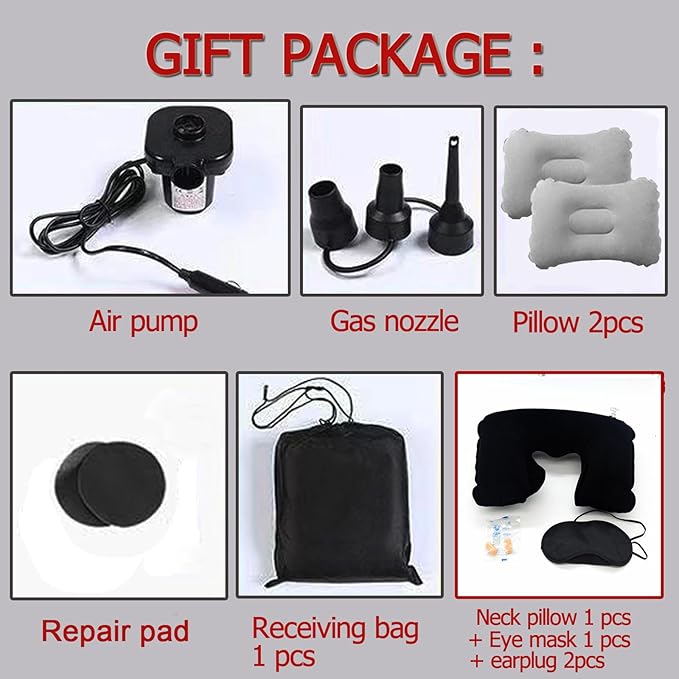 - Car Inflatable Mattress Item:Car air bed only 2.5 KG weight,Can be folding,Easy to carry.This package include 1 air bed,2 air pillows,1 air pump,1 air foot Piers,1 soft travel neck Inflatable pillow,1 sleep mask,2 sleep earplugs,1 repair pad.