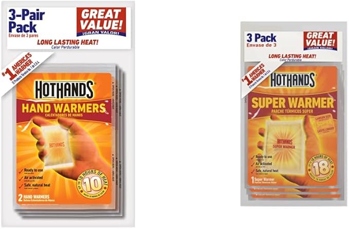 - Includes 3 HotHands Hand Warmers (2-1/4 in x 3-1/2 in) and 3 HotHands Body & Hand Super Warmers for keeping hands, feet, and body warm. Safe, natural heat. (Hand Warmer)