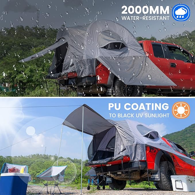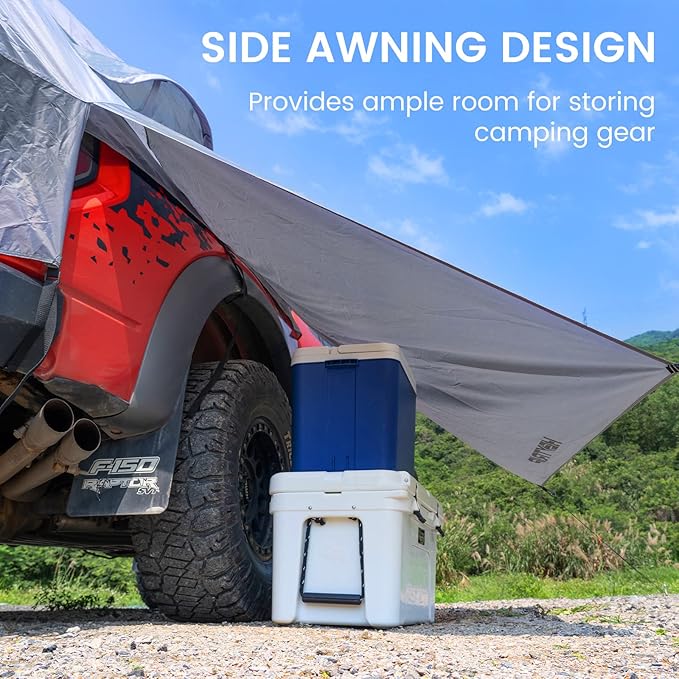 - Extra Tailgate & Side Space: Maximize storage and relaxation space around your pickup truck!Our innovative tailgate and side awning provide ample room for camping gear, while also offering shade from the sun or rain. It's perfect for fishing trips and other outdoor activities, ensuring you have everything you need at your fingertips.