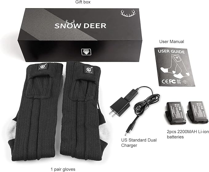 - 【Upgraded One Touch Smart Controller With Power Indicator & Use 7.4V Battery Instead of 3.7V & 5V】: SNOW DEER battery heated socks with Upgraded one touch smart controller which with power indicator. you can easily know how much power left and adjust heat settings easily. Also we used 7.4V 2200mAh lithium polymer rechargeable battery .the heating time will longer than 3.7V&5V heated socks and the temperature will be more stable.