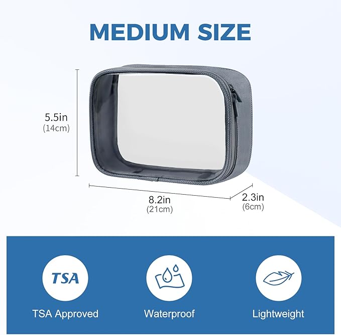 - 【TSA APPROVED】 The Moyad toiletry bag is TSA approved, made of clear PVC material, and complies with the TSA 3-1-1 liquids rule. Each bag measures 8.2 x 5.5 x 2.3 inches and is spacious enough to hold several 3oz liquid bottles. It helps you easily locate items and pass security checks quickly
