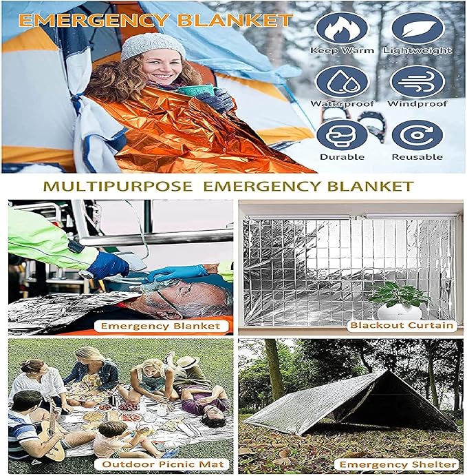 - ✅ MULTIPURPOSE SURVIVAL THERMAL BLANKET: Perfect for waterproof, moisture-proof, UV-proof with high low temperature resistance protection. It is very suitable as a outdoor gear for both men and women for such activities as hiking, camping, backpacking and mountaineering. These mylar thermal blankets can be used as ground covering, sleeping bag liner, emergency poncho, tent car blanket camping tarp survival against wind rain cold heat dirt dust...