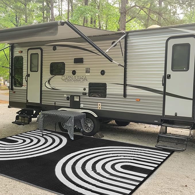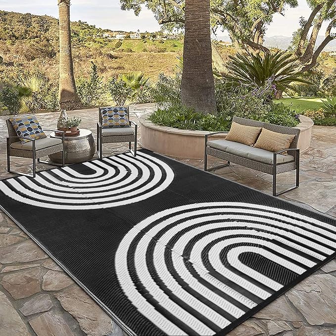 - Unique Design: Our outdoor rug features a double rainbow pattern, simple and classic black and white design, easily match any of your patio furniture and outdoor space, complement your modern style. The reversible design gives two looks, and when one side of your rug wears down, just flip it over and it'll give your patio a whole new look. (Note: There may be some creases when first used, simply unfold the rug and lay it flat or press it with heavy object and it will recover flat completely.)