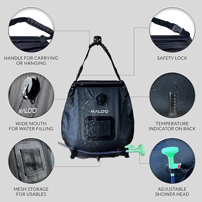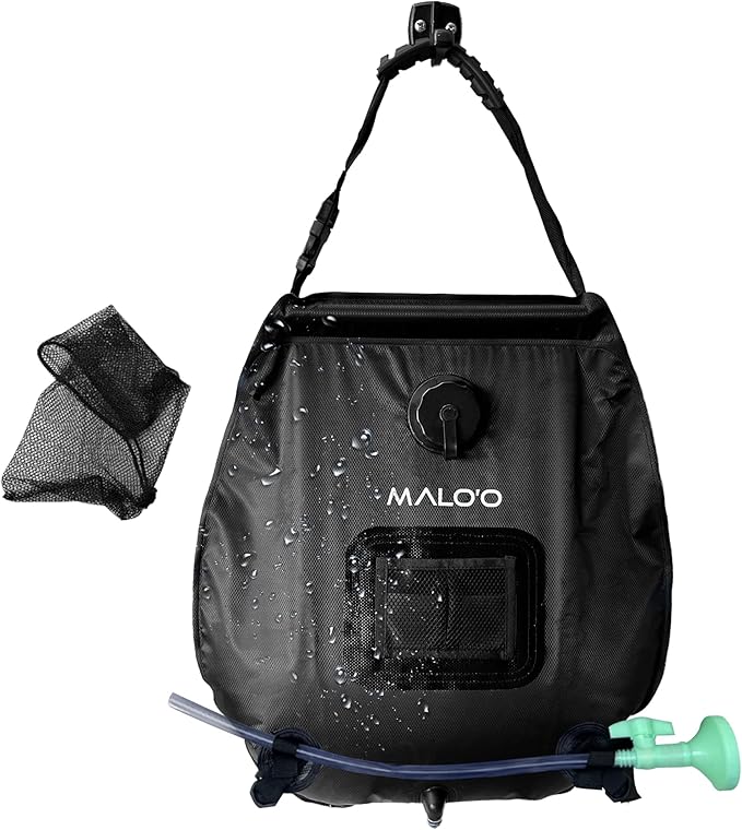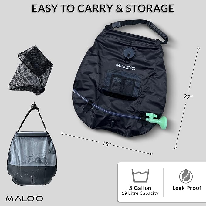 Malo'o 5 gallon/20L Portable Solar Shower Bag, Solar Heating Camping Shower Bag with Removable Hose and On-Off Switchable Shower Head for Camping Gear, Surfing, Beach, Swimming, Outdoor Travel, hiking