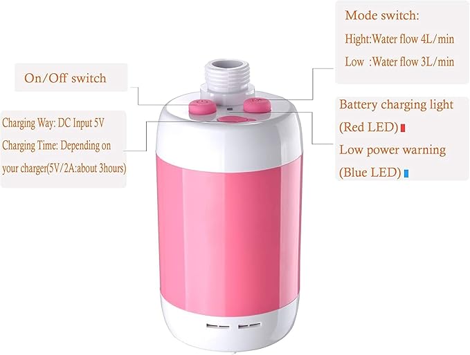 - [Built-in High-energy Lithium Battery]: The portable camping shower is built-in 4800mAh rechargeable battery , and scientific equipped with low battery indicator light and charging indicator light