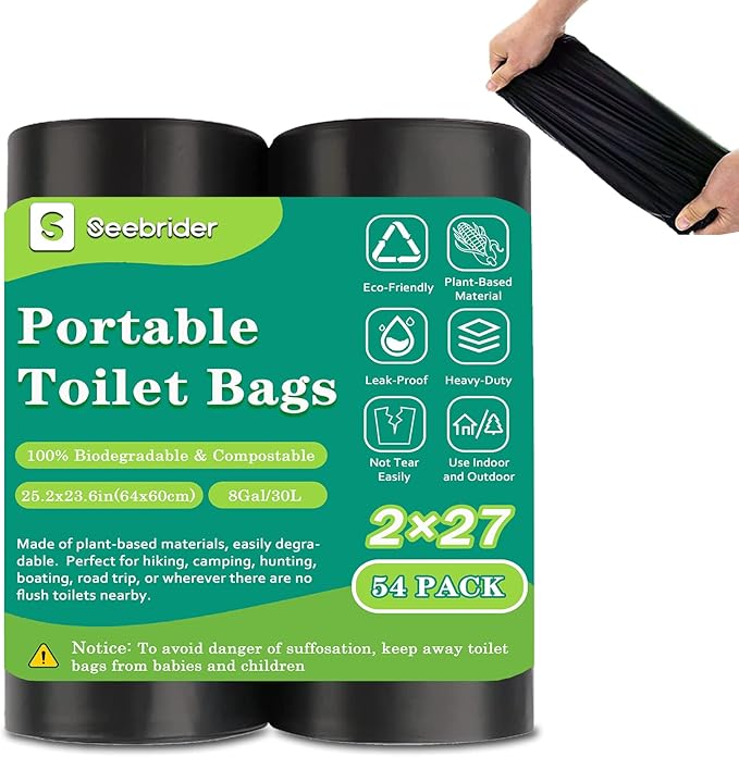 - 54 portable potty bags🚽: There are 54 toilet bags inside, divided into 2 rolls, each roll has 27, enough to meet your needs. portable toilet bags are composed of natural corn plant starch, which is biodegradable and compostable and can be internally decomposed into the soil in 45-180 days, making them safe and environmentally friendly to use.