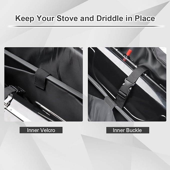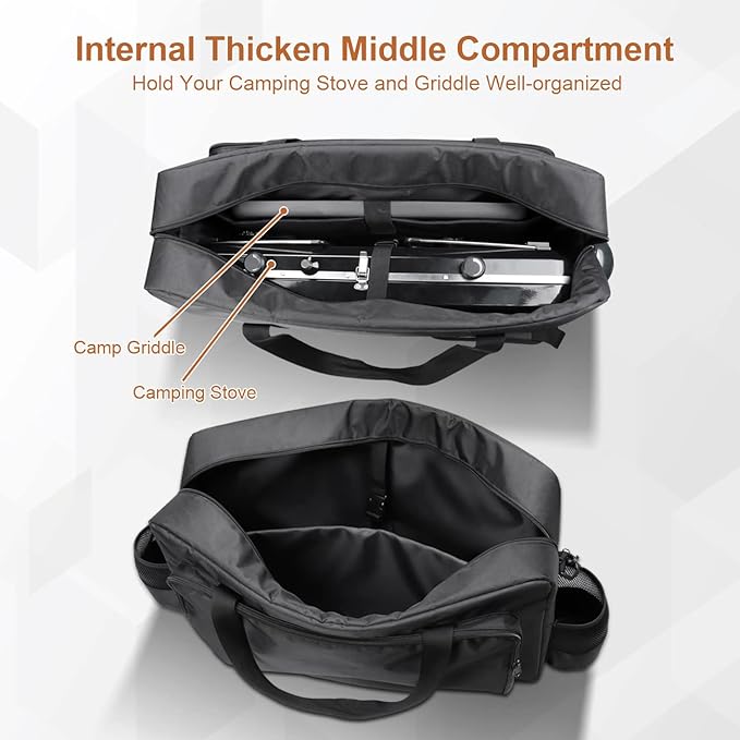- With an internal thicken divider to store your griddle, tongs and other accessories. An outer pocket to store accessories and some cooking utensils.